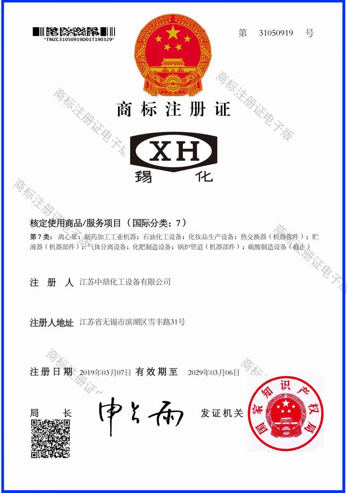 【中鼎喜訊】2019年4月8日經過多年努力,中鼎企業終于拿到曾經由1985年12月04日無錫縣化工設備廠注冊的“錫化”牌商標的圖形商標,圓滿完成“錫化”老品牌的有效保護。為中鼎企業樹立品牌打下堅實的基礎!